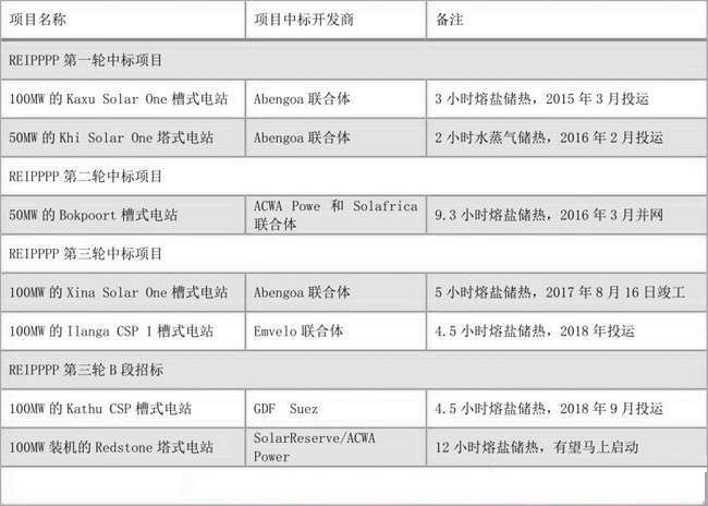 上述項目均隸屬于南非可再生能源獨立電力生產商采購計劃(REIPPPP),該計劃已完成的三輪招標共涉及光熱發電項目7個,總裝機為600MW。目前已建成300MW,完成50%規劃量,其余項目除Redstone的購電協議(PPA)尚未簽署外,裝機100MW的IlangaCSP1槽式項目、Kathu項目均在建中,預計將于2018年投運。