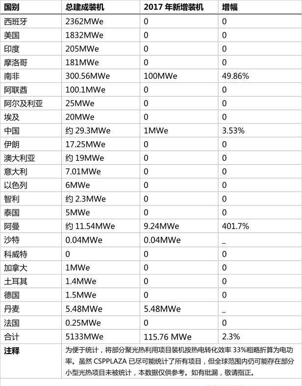 圖:各國2017年新增CSP建成裝機