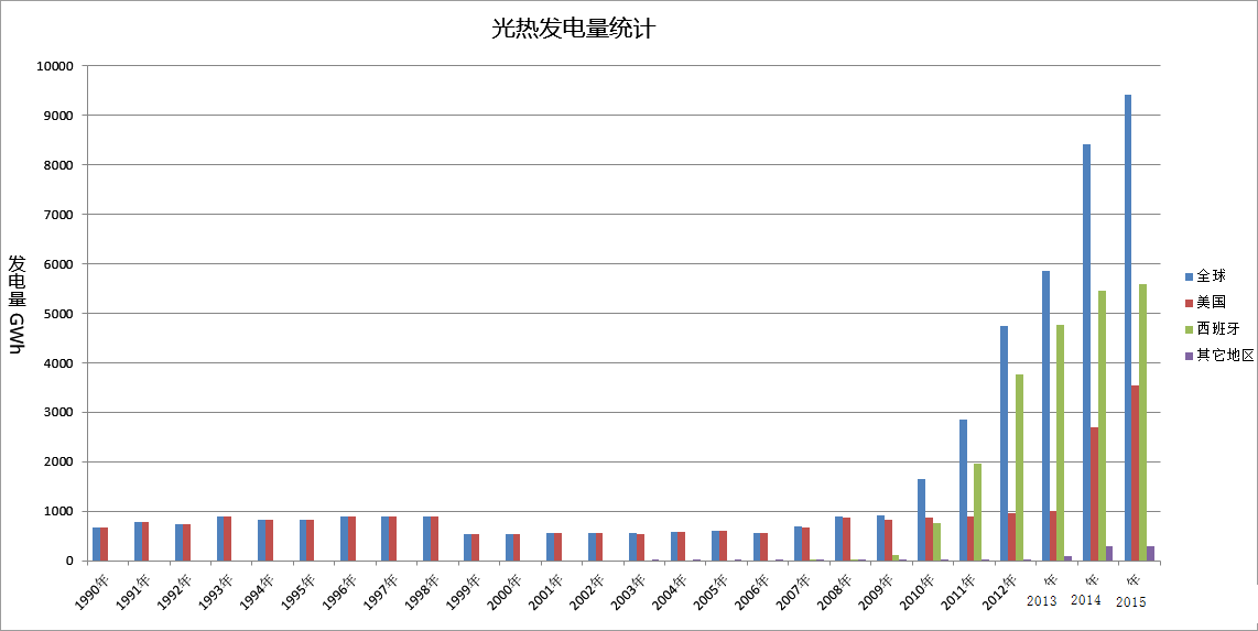 2015年,全球電力總發電量為24344520GWh,光熱發電的供電比例約為0.039%。從下面的全球光熱發電量統計柱狀圖可直觀反映,光熱發電的總發電量大致經歷了1990~2008年的平穩期、2009~2015年的成長期兩個階段。
