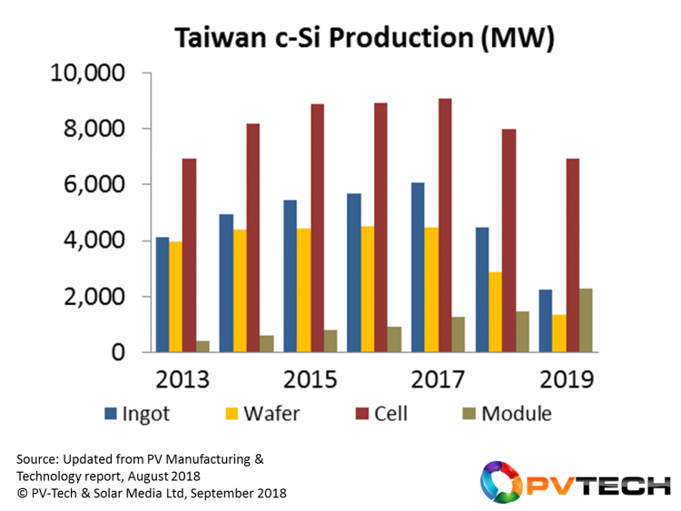 本文總結了我們PV-Tech內部研究團隊的最新分析,我們調整了我們在臺灣活躍的20家公司的模型和預測,如今在臺灣生產硅錠,硅片,電池和模塊。一旦我們進入臺灣太陽能2.0,隨著子公司即將合并和重新分配,這個數字將在年底前接近15,并在2019年初進一步向下。