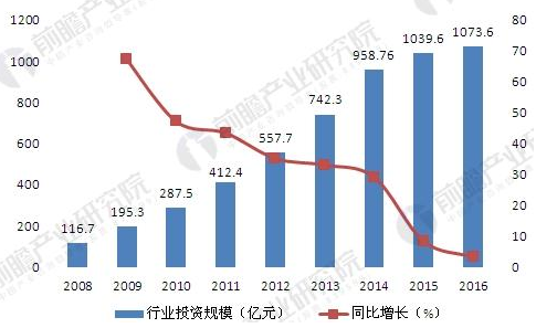 2008-2016年中國合同能源管理行業投資規模變化情況(單位:億元,%)